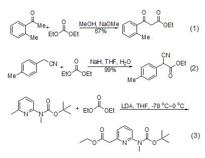 carbonylation of carbanions diethyl carbonate is often used for the carbonylation of enol anions. the reaction conditions of this reaction are relatively mild and the yield is high. during the reaction, sodium hydride, potassium hydride, lda (or a mixture thereof), etc. can be used as a base. at the same time, the selection of reaction substrates is relatively wide, and most of them have molecules with electron-withdrawing groups [such as carbonyl (formula 1) [1], cyano (formula 2) [2] sup>, ester group [3] and enamine [4,5] (formula 3), etc.] can occur at the α-position carbonylation.