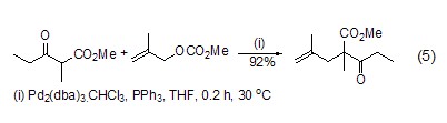 alkylation or allylation under appropriate conditions, using palladium-triphenylphosphine as a catalyst can achieve β-carbonyl ester, β-diketone, malonate, cyanide and nitro compound (formula 5)[10].